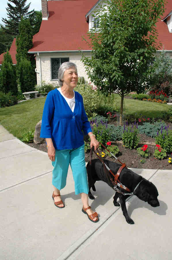 Many people impacted by blindness use guide dogs to aid in their mobility. A “working” guide dog is equipped with a harness that the handler grasps. When a guide dog is not working, the handler will usually release the harness and control the dog with a leash.