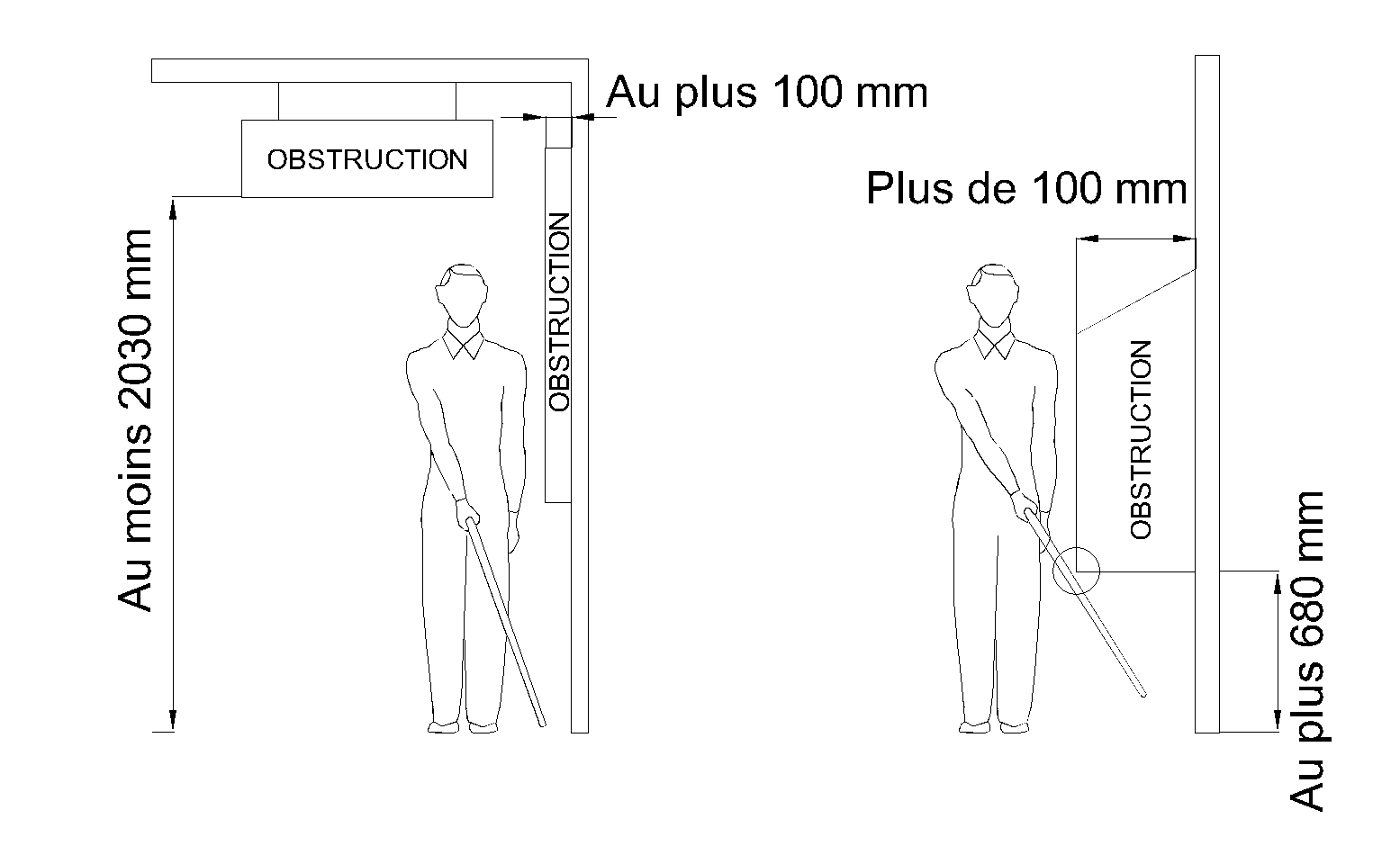 Les objets ou panneaux installés à moins de 2030 mm au-dessus de la surface de marche sur des murs, des colonnes ou des supports autoportants ne doivent pas faire saillie de plus de 100 mm à moins d’être détectables au moyen d’une canne.
