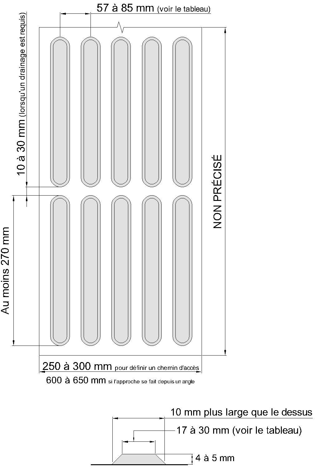 - Le dessus des barres doit avoir une longueur d’au moins 270 mm. Si un drainage est nécessaire, un espace de 10 à 30 mm doit être laissé entre les extrémités de deux barres.