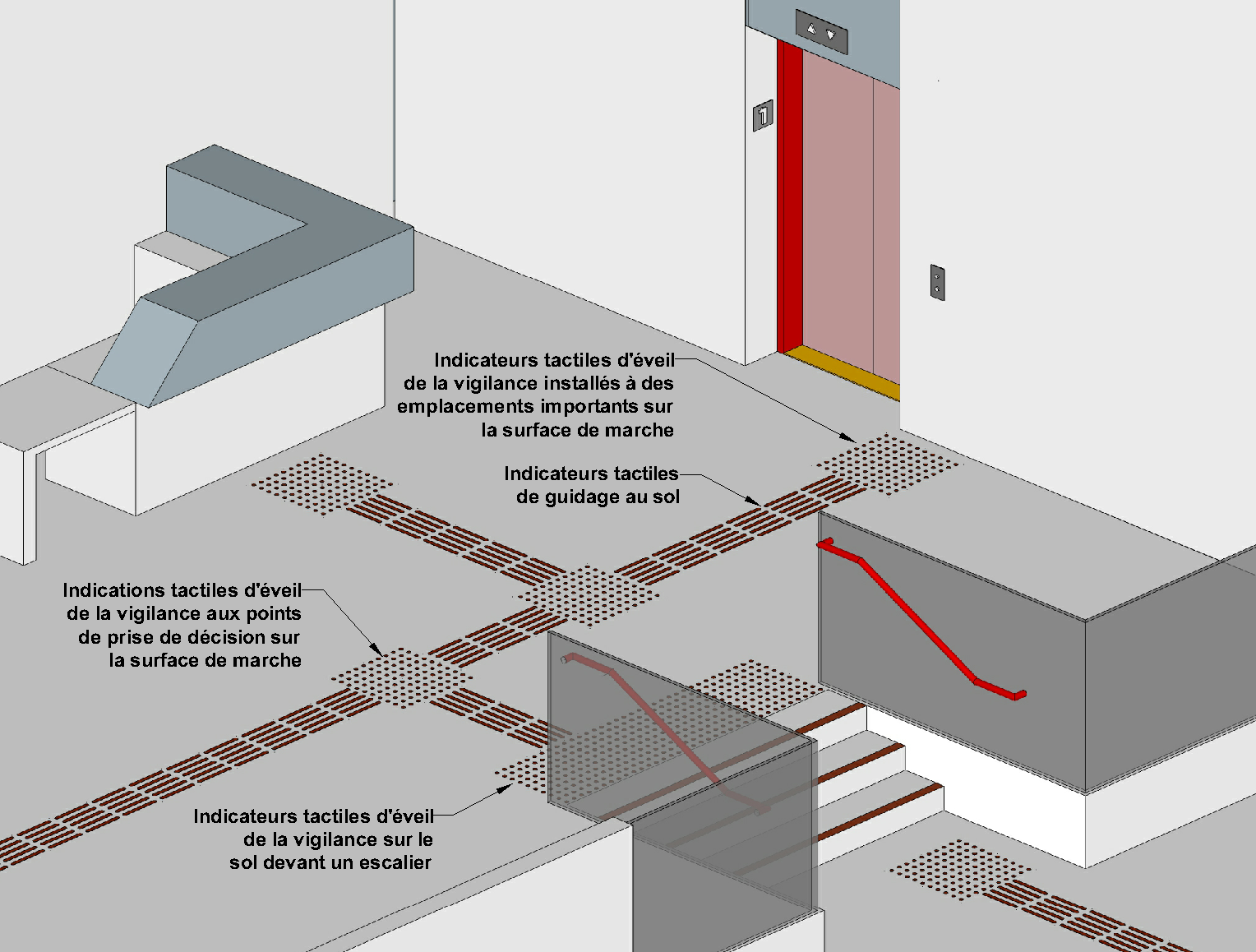 Les indicateurs tactiles de guidage au sol doivent consister en des séries de barres allongées parallèles, à dessus plat, qui vont dans le sens du déplacement.