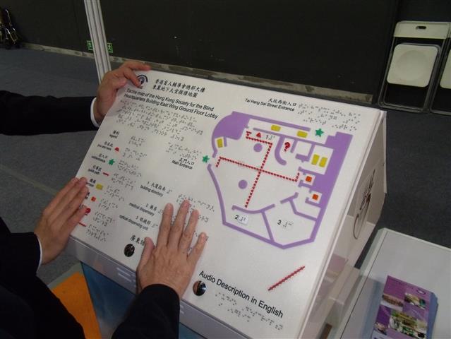 - A braille overlay that folds over and locks onto a map, giving details about facilities