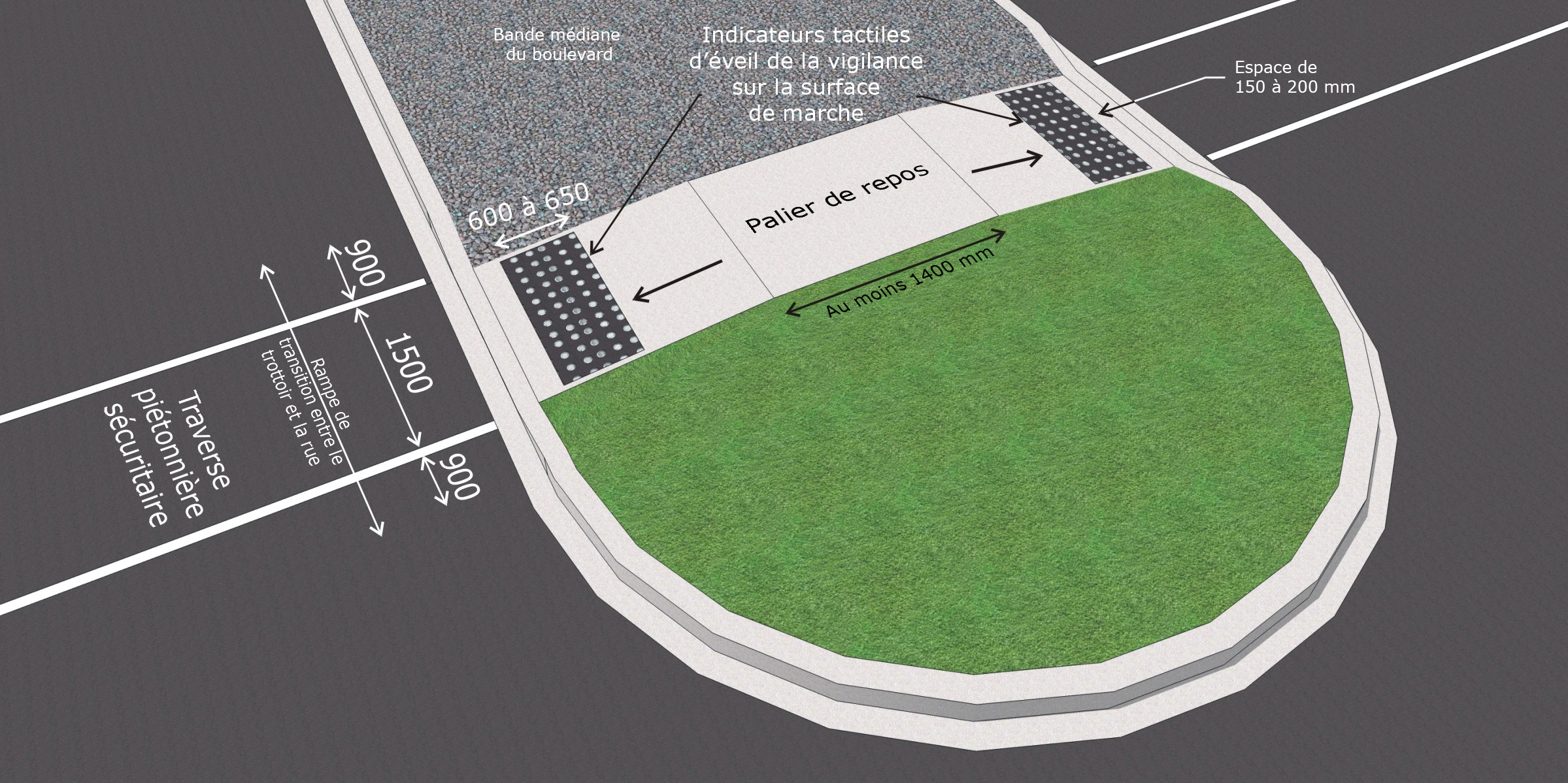 Lorsqu’un îlot de refuge surélevé fait partie d’un passage piétonnier, il doit être accessible par une voie piétonnière qui le traverse de plain-pied, ou par des bateaux de trottoir pratiqués des deux côtés. Un îlot de refuge doit comprendre un palier de repos d’au moins 1400 mm de long et, de chaque côté, des indicateurs tactiles appropriés d’éveil de la vigilance sur la surface de marche.
