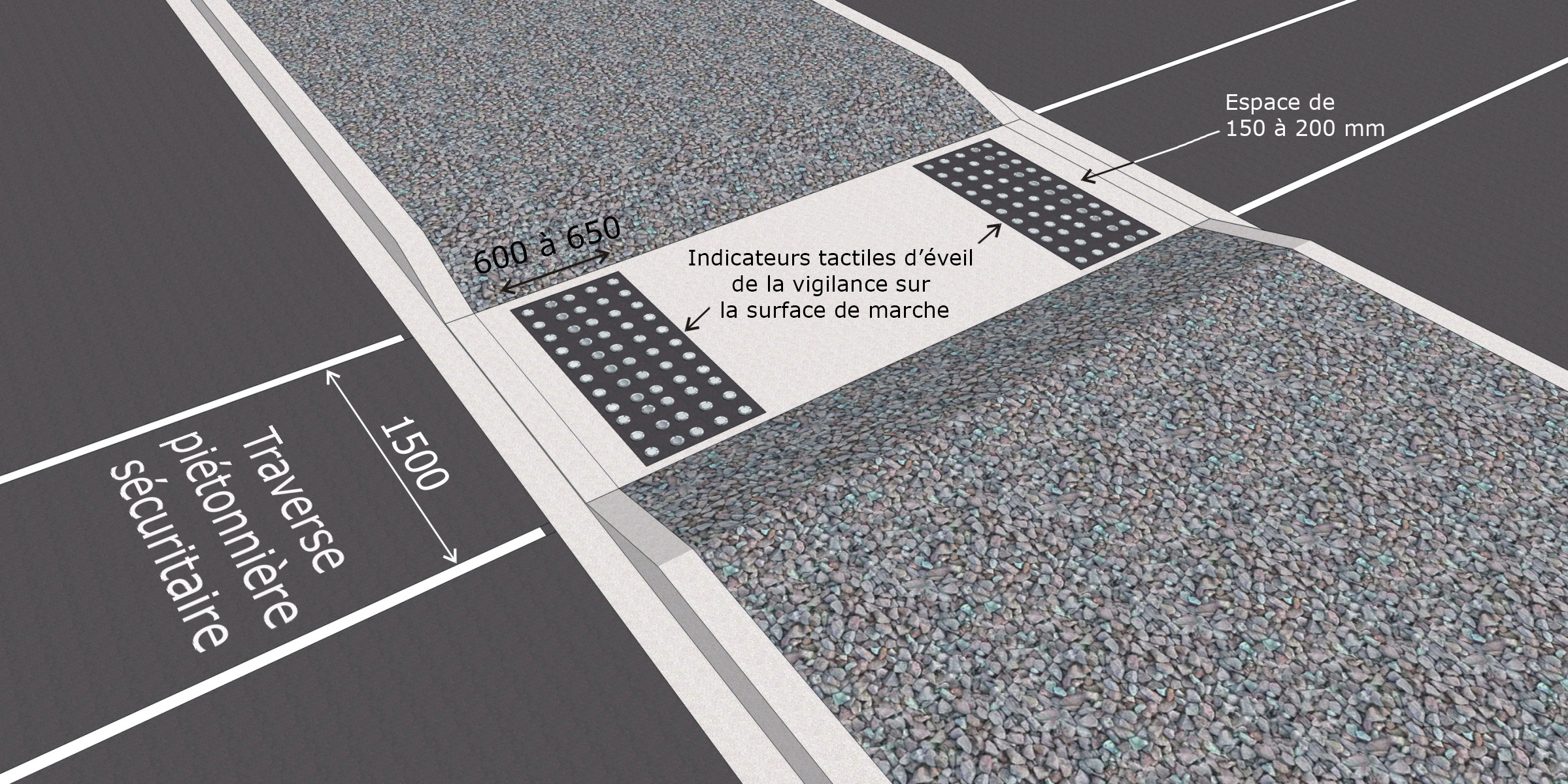 Lorsqu’un îlot de refuge est au même niveau que la surface de la rue, la voie piétonnière qui le traverse doit commencer et se terminer, sur toute sa largeur, par des indicateurs tactiles d’éveil de la vigilance. Ces indicateurs doivent être à une distance de 150 à 200 mm derrière la ligne de bordure, mesurer de 600 à 650 mm de long et être de couleur contrastante par rapport au reste de la voie piétonnière. Pour de plus amples renseignements, consultez la section Indicateurs tactiles de surface de marche.