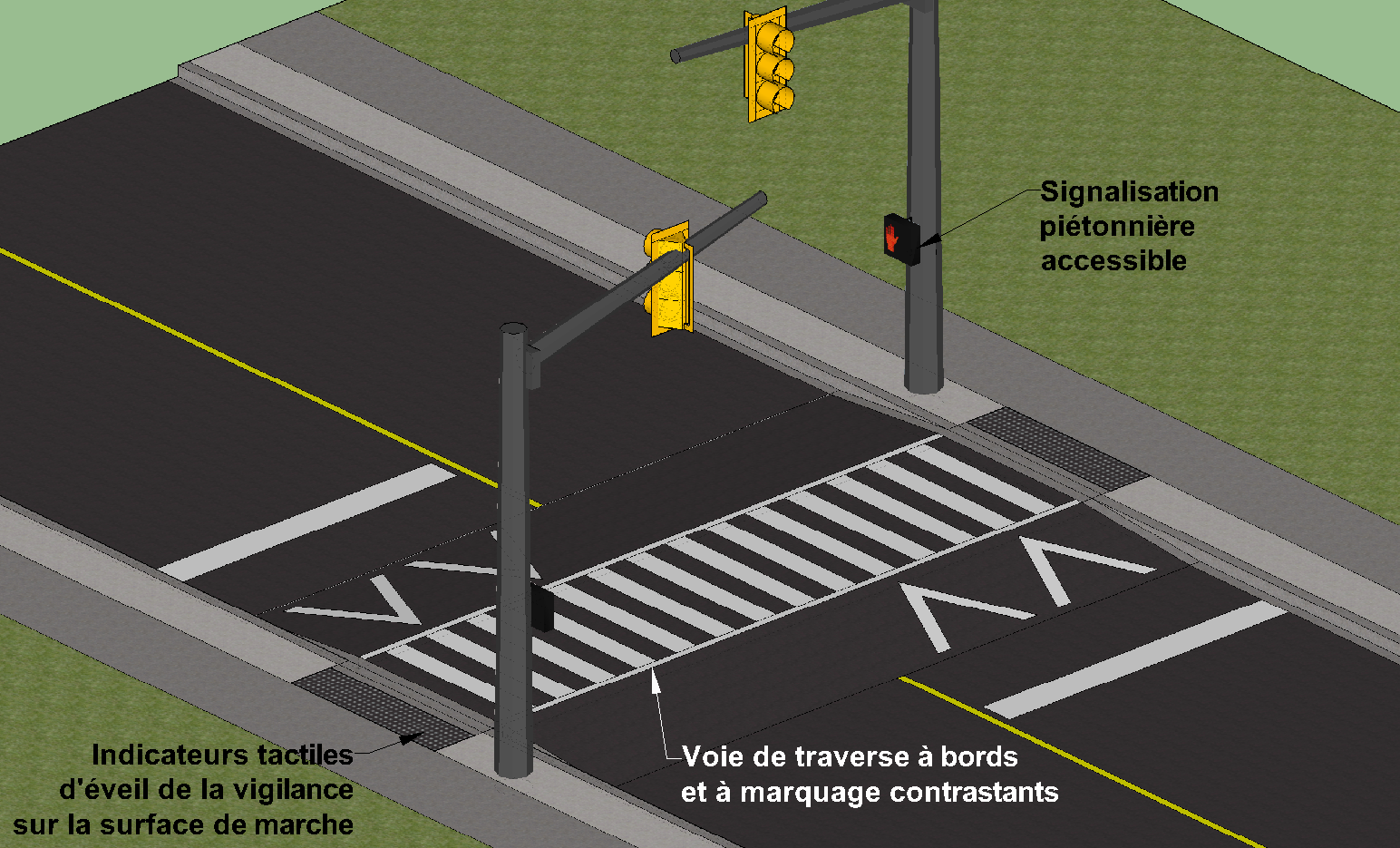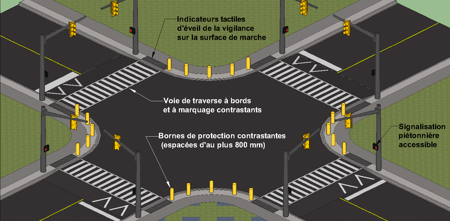 Comme pour toute traverse piétonnière, la surface de marche sécuritaire dans une voie de circulation automobile doit être clairement délimitée sur le revêtement de chaussée par des marques comme des lignes tiretées ou des rayures à fort contraste. Il est de plus essentiel d’utiliser des indicateurs tactiles d’éveil de la vigilance au sol sur toute la largeur des points d’entrée de la traverse piétonnière. Les personnes touchées par la cécité peuvent ainsi détecter la transition du trottoir à la traverse piétonnière. Lorsque ces structures de circulation sont déployées, des bornes de protection marquées peuvent aider les piétons vivant avec la cécité à se diriger vers l’axe le plus sécuritaire pour traverser l’intersection. Pour de plus amples renseignements, consultez la section Indicateurs tactiles de surface de marche.