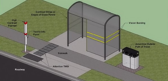 Bus shelters are typically designed to be mostly transparent, to allow bus drivers to see passengers inside them. As with glass doors and panels in other contexts (see sections Exterior Doors and Mirrors, Glazed Screens and Sidelights), the edges of all panels should be marked with a colour-contrasting strip and have contrasting stripes at eye level. Glass panels should extend as close to the ground as possible so that panels are cane detectable. Additionally, panels should be consistent in width from top to bottom to prevent overhead or tripping hazards.