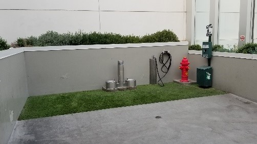 Guide dog relieving areas should be easily accessible to a barrier free entrance following a straight path of travel. The relieving area, regardless of if it is located within a secured area or next to a building entrance, should enable a guide dog handler to allow a guide dog on a 1,500 mm leash to circle its handler prior to relieving itself.