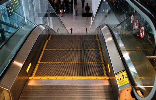 The top nosings (both horizontal and vertical edges) of escalator steps should have colour/brightness-contrasted strips that run the width of the step and are a maximum of 50 mm deep.
